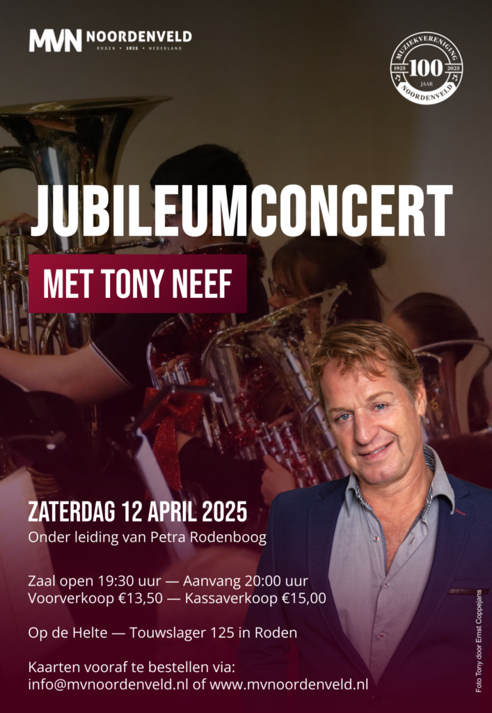Het belooft een avond vol muzikale hoogtepunten te worden, waarin zowel jong als oud samenkomt om het 100-jarig jubileum van Muziekvereniging Noordenveld te vieren. Of je nu een fan bent van de grote musicals, van muziek van toen of van de modernere hits, er is voor ieder wat wils. De energie, de passie en de toewijding van het orkest en Tony Neef zullen de zaal zeker vullen en iedereen meenemen op een muzikale reis die nog lang in de herinnering zal blijven. Mis het niet en vier mee met dit bijzondere jubileum. We hopen je te verwelkomen op 12 april in Roden, voor een avond die je niet snel zult vergeten!