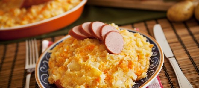 Serveer de hutspot met een rookworst of lekkere vegetarische balletjes of heerlijke spekjes